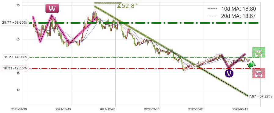 ♘ 阻力价格位19.57,可信任强度44.88%,距离最后交易2022-08-12形成的收盘价格18.65相差 +4.93%