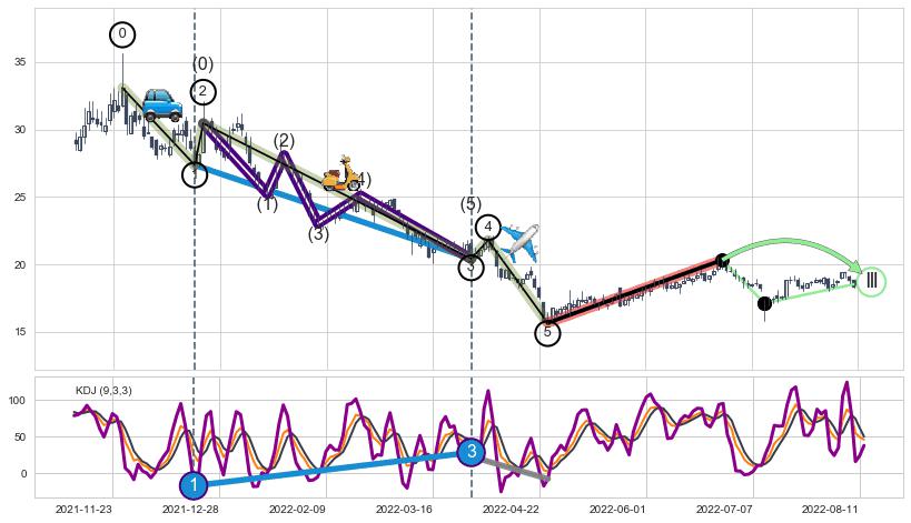 ➣ 第一, 三驱动浪端点:【KDJ】走势出现【常规背离 & 反转信号】背离程度59.82%,背离夹角角度77.2˚,背离程度较大