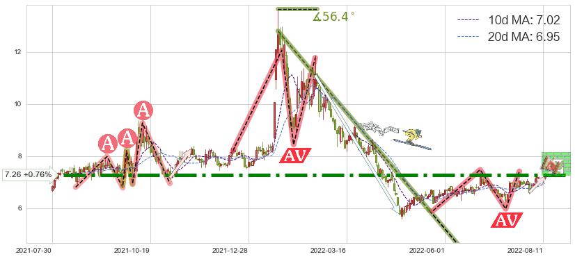 2022-06-28: 第一阻力位7.26强力阻拦了上升趋势,成功阻止了价格的继续上涨。