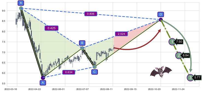 ➣ 未完成【蝙蝠】形态起点X: 2022-03-22, 已到达C点: 2022-07-15, 预测最终D点: 2022-10-20, 共147交易日