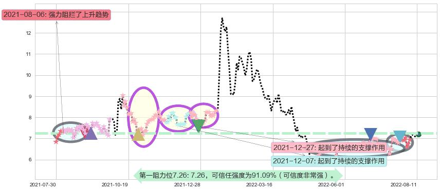 ♘ 阻力价格位7.26,可信任强度91.09%,距离最后交易2022-08-12形成的收盘价格7.21相差 +0.76%