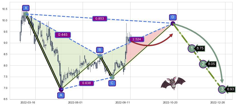 ➣ 未完成【蝙蝠】形态起点X: 2022-03-02, 已到达C点: 2022-07-15, 预测最终D点: 2022-10-13, 共151交易日