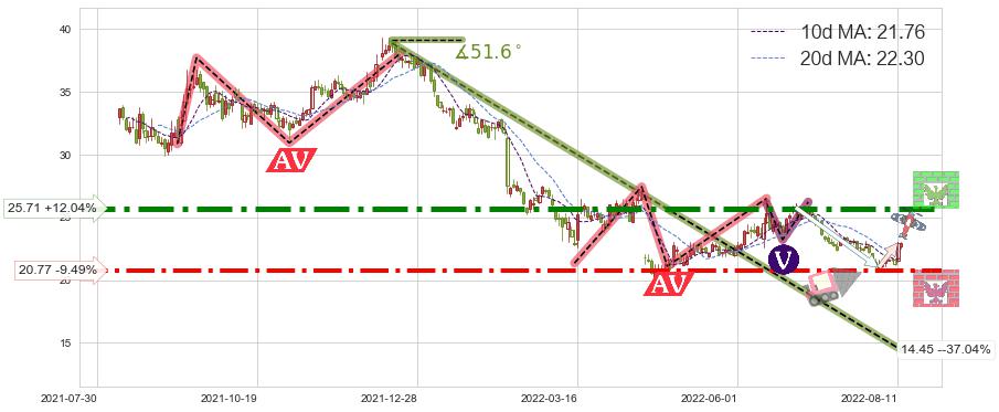 ♘ 支撑价格位20.77,可信任强度73.79%,距离最后交易2022-08-12形成的收盘价格22.95相差 -9.49%