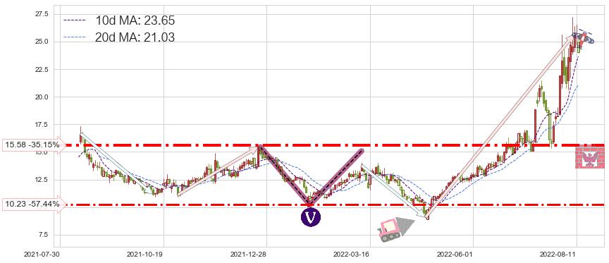 ♘ 支撑价格位15.58,可信任强度83.59%,距离最后交易2022-08-12形成的收盘价格24.03相差 -35.15%