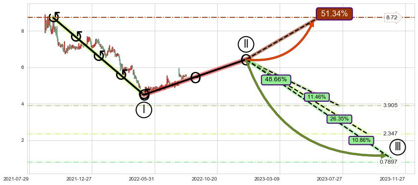 ♘ 阻力价格位7.24,可信任强度64.46%,距离最后交易2022-08-12形成的收盘价格5.50相差 +31.62%