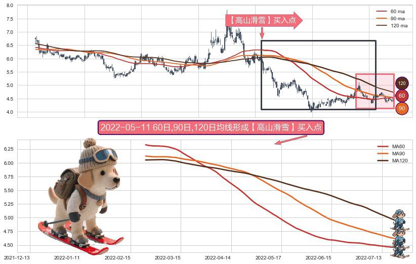 形态多维评估: ⚀ 2022-02-23日-2022-07-20日显现 60日-90日-120日均线 【高山滑雪】买入点 看多信号,后市看涨,买入