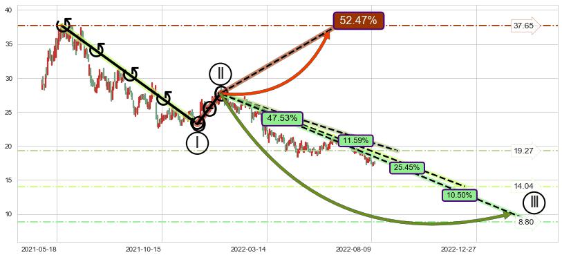 ➣ 大趋势循环浪继续向下概率47.53%