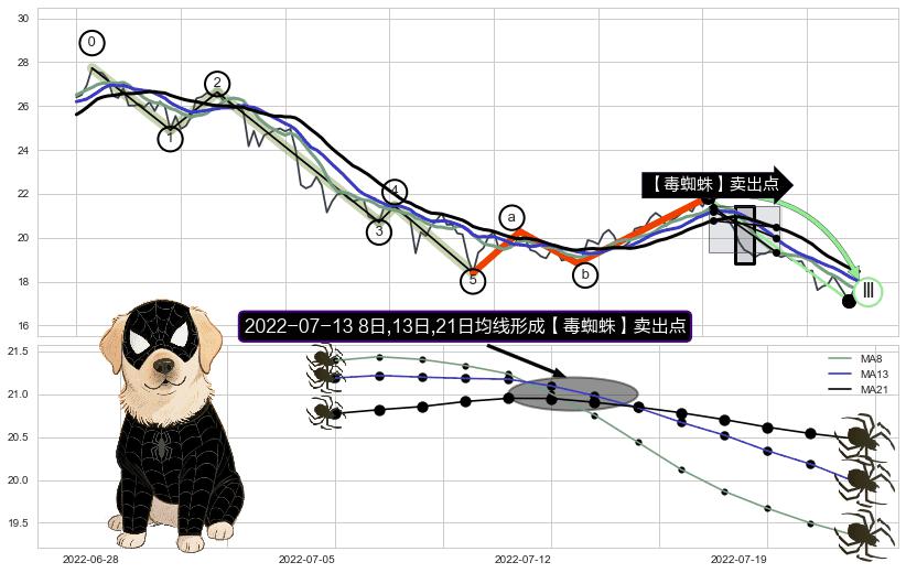 | 4 🅚:【毒蜘蛛】卖出点 ➕ ☯️:缠论中枢点下降缠中枢B破位后距离1买距离较远,随后猜想后续持续下跌(趋势跟踪) ☞ 看空信号 ⇥ 【均线】交织【图形】⇥ 综合量化分数: 30 | > |