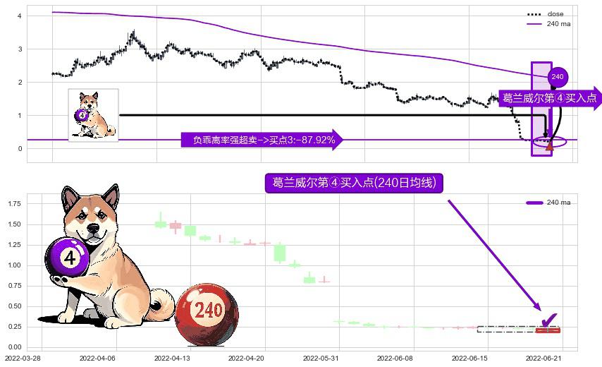 形态多维评估: ⚀ 2022-06-21-日显现 葛兰威尔均线 240日均线 第④买入点 下降趋势均值回复的短线反弹信号,后市看涨,买进信号