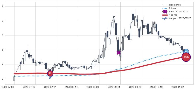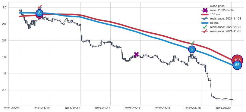下跌趋势2021-10-20-2022-06-21,均线105, 85确认关键阻力2处