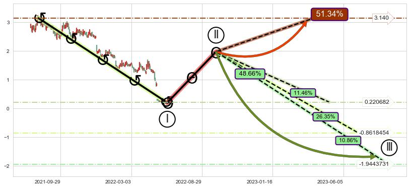 ➣ 循环浪继续向下【平均值】位置(2023-07-05, -0.8618454),匹配聚类样本比例54.15%, 可能性概率26.35%