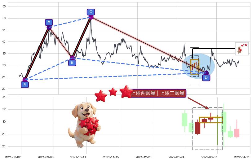 | 3 🅚:【蛟龙出海】买入点 ➕ 📡:谐波赛福已到达d点:猜想c下行到达d点后报复性拉升上涨(均值回复) ☞ 看多信号 ⇥ 【均线】交织【图形】⇥ 综合量化分数: 55 | > |