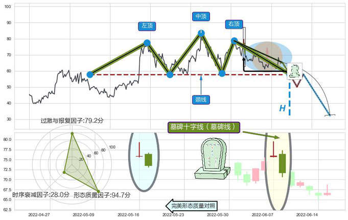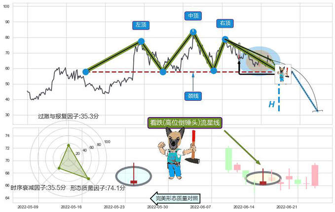 ➢ 墓碑十字线(墓碑线) 🔜 三重顶临近支撑猜想转换阻力下跌 综合量化分数:42.04 【偏空】