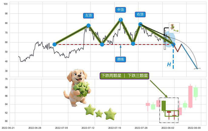 ➢ 🐸 下跌两颗星 | 下跌三颗星形态方向: 消极反向形态,对未来预期 看空