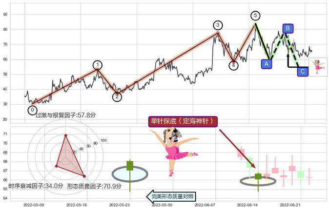 ➢ 🕰 价格走势在2022-06-14至2022-06-14期间形成单针探底(定海神针),残存影响值:3.48