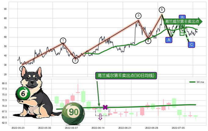 ➣ 🕰 价格走势在2022-06-06至2022-06-20期间形成葛兰威尔第⑥卖出点,残存影响值:-12.77