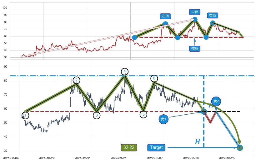 ➢ 最小反转跌幅→𝐇: 25.69 (三重顶波峰高点到两个波谷连线的垂直距离)