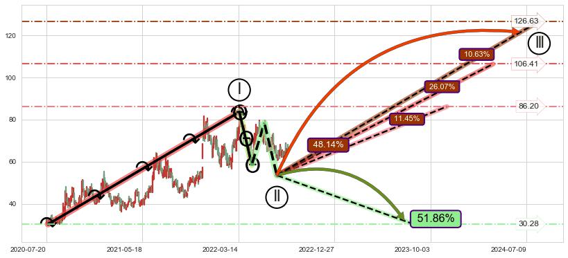 ➣ 高概率大级别循环上涨浪被破坏,反转向下(突破5浪起点)概率51.86%