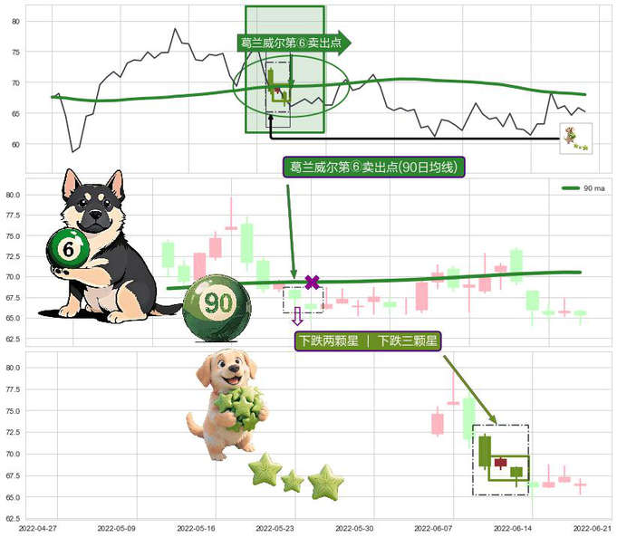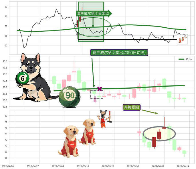 ➣ 2022-06-13-日显现 葛兰威尔均线 90日均线 第⑥卖出点 走势反转见顶信号,后市看跌,卖出信号