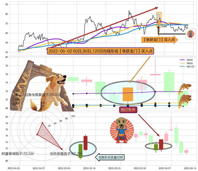 ➣ 旭日东升 + 【鱼跃龙门】买入点鱼跃龙门均线交叉买入点信号叠加后【目标达成率】中等,【看多】信号叠加【存续影响中等】