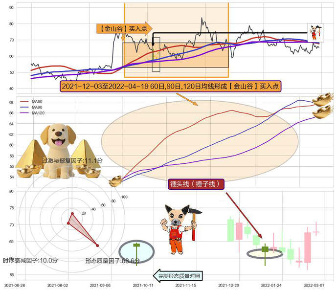 ➣ 锤头线(锤子线) + 【金银山谷】买入点金银山谷均线交叉买入点信号叠加后【目标达成率】低,【看多】信号叠加【存续影响大】
