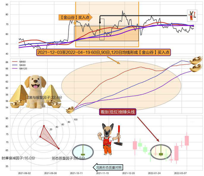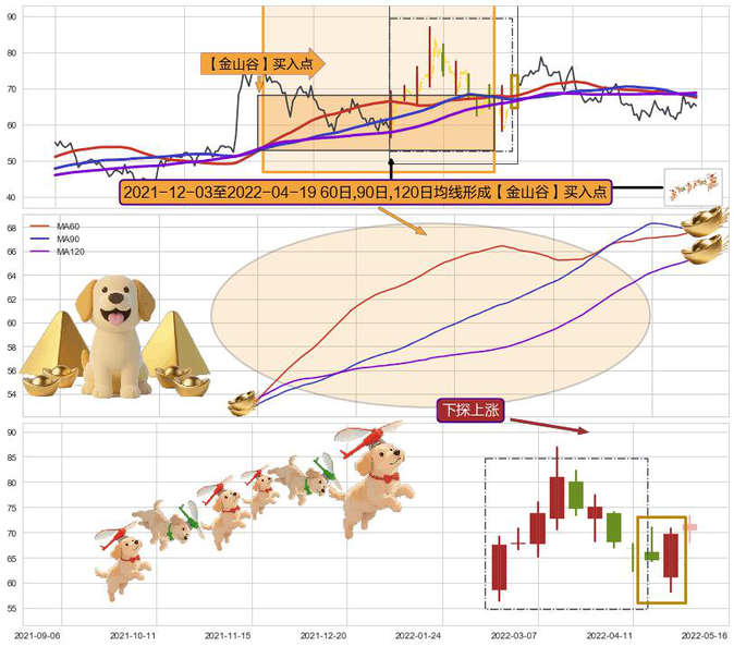➣ 2021-12-06-日至2022-04-19-日显现 60日-90日-120日均线 【金山谷】买入点 其再次确认了买入信号,可靠性更强,买入