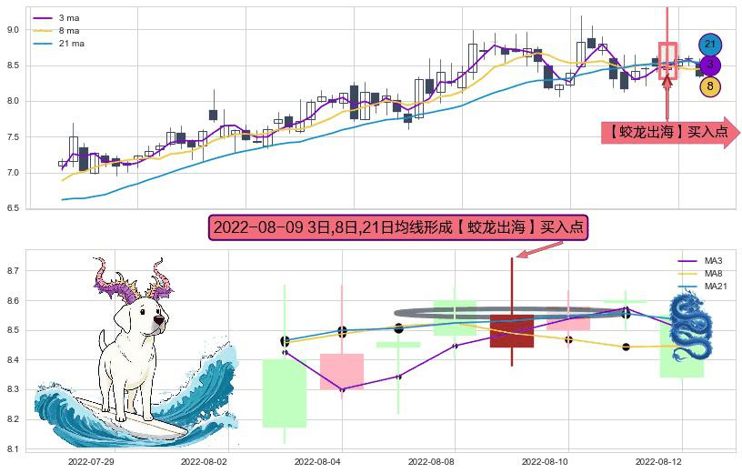 形态多维评估: ⚀ 2022-08-09日显现 3日-8日-21日均线 【蛟龙出海】买入点 看多信号,后市看涨,买入