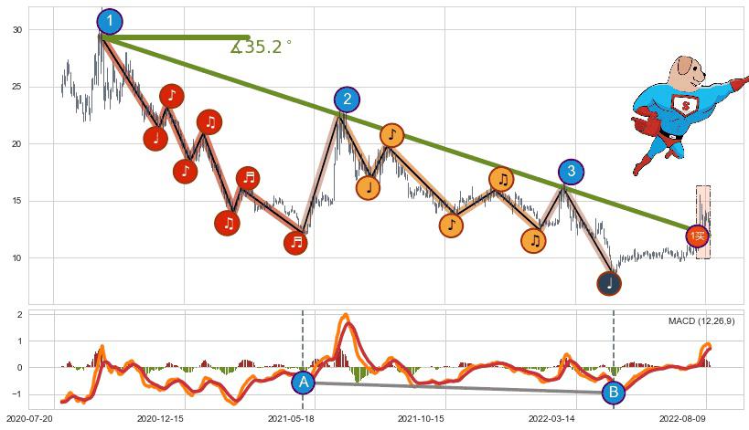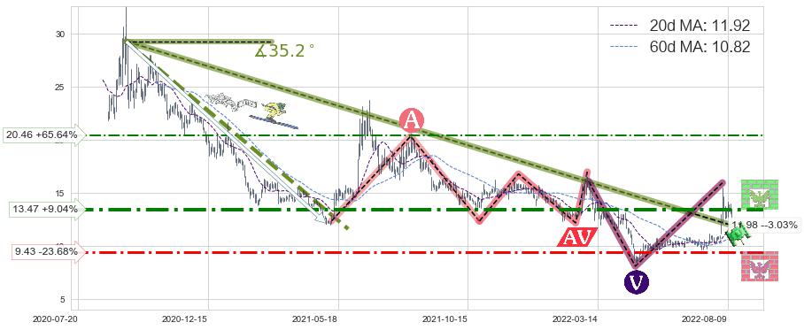 ➣ 2020-09-09-2022-06-27下跌趋势存在反转上涨[机会],虽然原下跌趋势的阻力位(11.98)已被突破,但其阻力效果尚存,原下跌趋势角度: 35.2˚