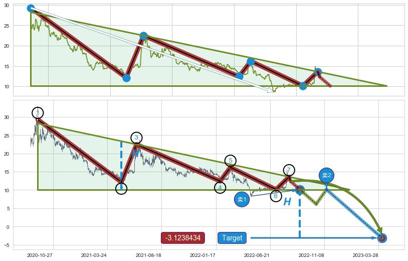 ➣ 最小中继整理跌幅→𝐇: 13.24 (下侧直角边第一支撑点②与斜边垂直距离)