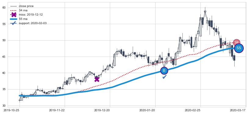 ⚅ 买点向上突破均线后,价格走势很纠结,不断在均线周围试探,有再次下探破位均线的可能