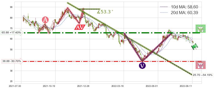 ♘ 阻力价格位65.88,可信任强度91.65%,距离最后交易2022-08-12形成的收盘价格56.10相差 +17.43%