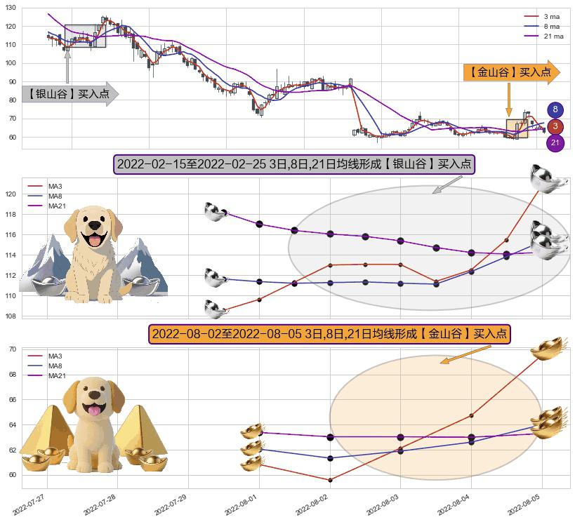 ⚀ 2022-08-03-日至2022-08-05-日显现 3日-8日-21日均线 【金山谷】买入点 其再次确认了买入信号,可靠性更强,买入