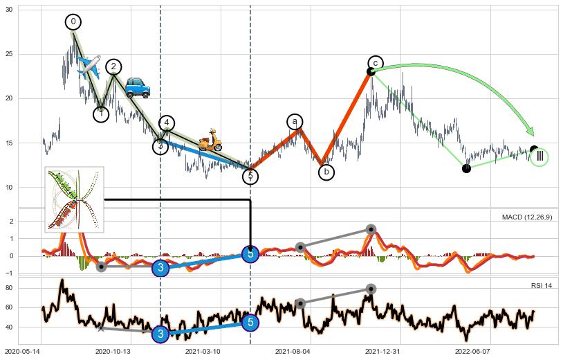 ➢ a,c调整浪MACD, RSI, KDJ走势都【未出现】背离,abc走势延续, 5浪反转概率增强