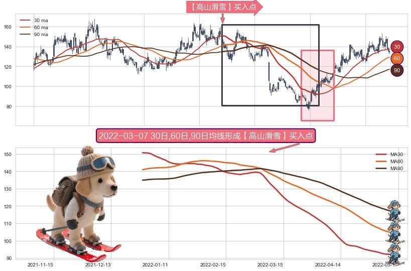 形态多维评估: ⚀ 2021-12-28日-2022-05-12日显现 30日-60日-90日均线 【高山滑雪】买入点 看多信号,后市看涨,买入