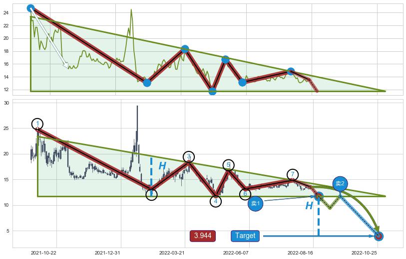 ➣ 【未确认突破,预测即将形成突破】下降三角形整理起点:2021-09-24, 预测突破点:2022-08-22,形态共220交易日
