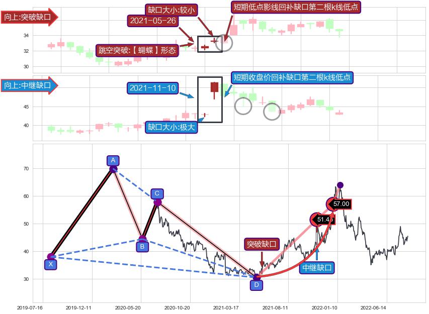 ➣ 突破缺口形成后,后续k已经超过14根,跳空突破【蝴蝶】形态关键点后, 出现【轻微回踩】迹象,短期低点影线回补缺口第二根k线低点