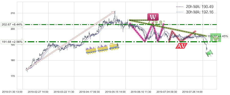 ♘ 阻力价格位191.68,可信任强度78.69%,距离最后交易2019-07-31 15:00形成的收盘价格186.90相差 +2.56%