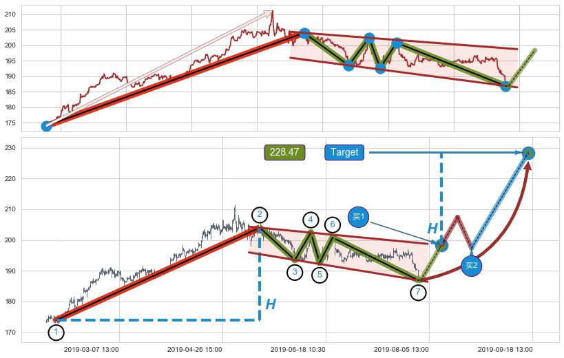 ➣ 降旗形:猜想临近关键阻力位突破点 → 临近拐点上涨 → 机会信号 → 大趋势均值回复