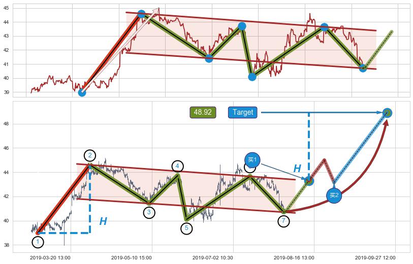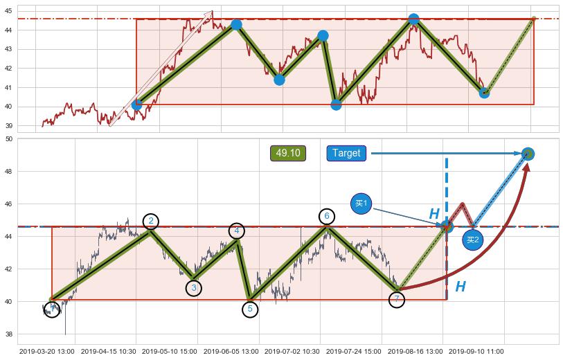 ➣ 上涨矩形整理:猜想临近关键阻力位突破点 → 临近拐点上涨 → 机会信号 → 大趋势均值回复