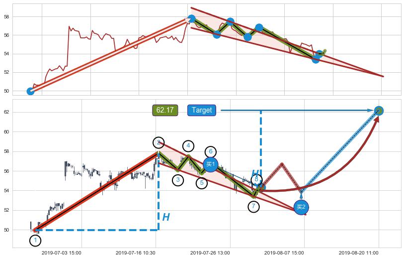 ➢ 最小中继整理涨幅→𝐇: 7.85 (𝐇楔型旗杆的长度:楔型起点→顶点)