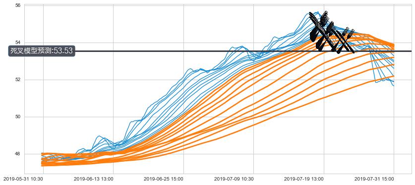 ➣ 90小时均线于(07-23 11:30: 54.11)形成【死叉】基于【死叉历史模型】预测死叉后最低波谷价格: 53.26, 死叉后最低价格51.55,已经下跌超出预测最低波谷价格, 预期反弹