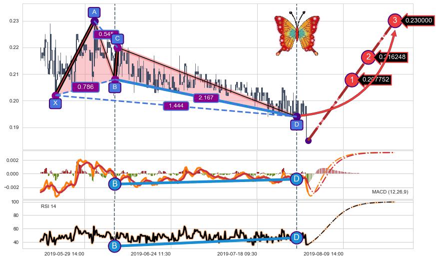 ➢ 谐波蝴蝶:c下跌到达d:猜想拉升 → 上涨 →【拐点】强支撑临近 → 大趋势均值回复
