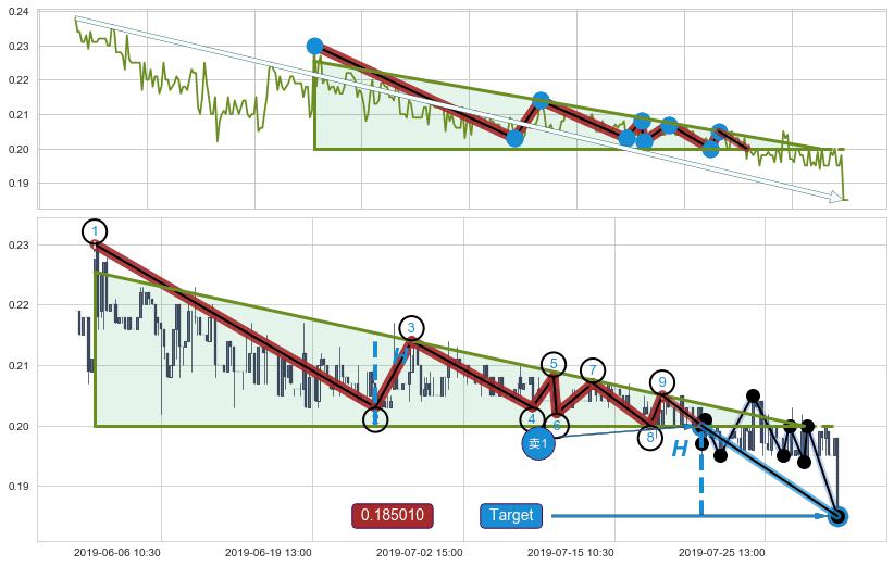 ➣ 下降三角整理:下跌目标target已达成:猜想强支撑位临近,预期反弹上涨(均值回复)
