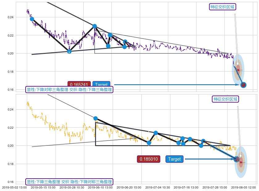 ➢ 下降对称三角整理:猜想预期下跌目标target即将达成,随后猜想强支撑来临,预期反弹上涨(均值回复)