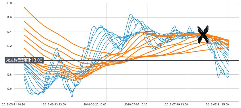 ➣ 45小时均线于(07-24 13:00: 13.38)形成【死叉】基于【死叉历史模型】预测死叉后最低波谷价格: 13.03, 死叉后最低价格12.62,已经下跌超出预测最低波谷价格, 预期反弹