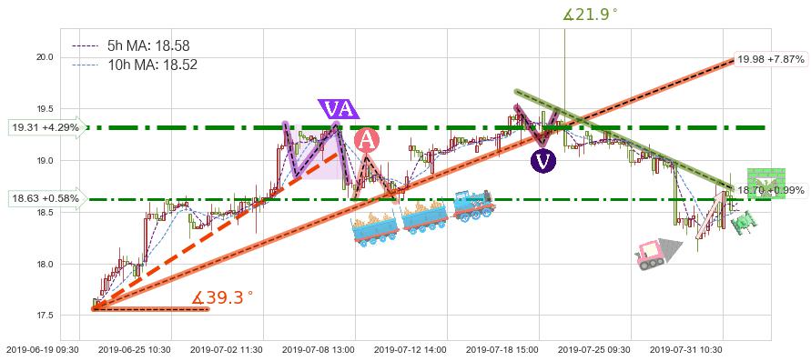 从2019-06-19 14:00至2019-07-18 15:00,共包含122个小时,阶段股价上涨9.93%,阶段股价变动位移路程比: 1 : 3,上涨趋势角度: 39.3