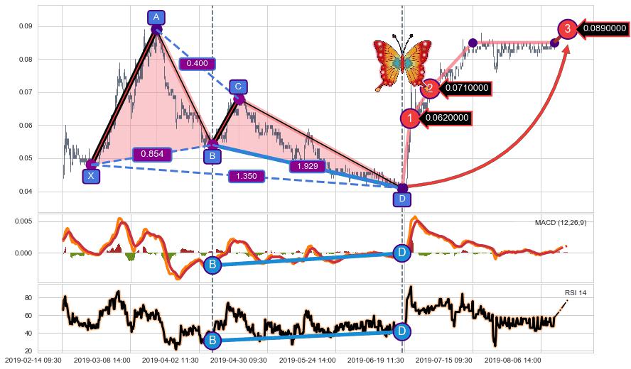 ➣ 已完成【蝴蝶】形态起点X: 02-25:10, 终点D: 06-18:15, 共455交易小时