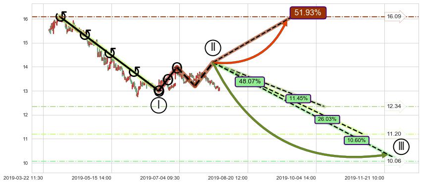 从2019-04-12 11:30至2019-06-10 09:30,共包含215个小时,阶段股价下跌-13.99%,阶段股价变动位移路程比: 1 : 6