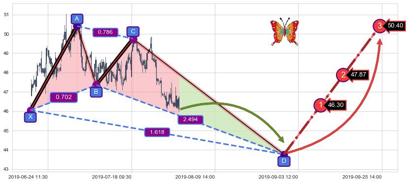 ➢ 距离预测D点位置有足够的下跌空间, 与看涨【蝴蝶】形态相反,实际方向【看跌】