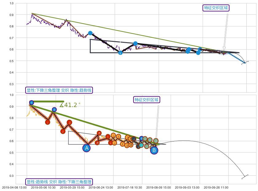 ➢ 下降三角整理与趋势线信号事件周期长度级别相同,同周期信号事件